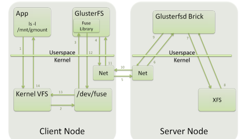 You can observe the process context switches happens between user and kernel space in above architecture. It is going to be a key differentiation factor when compared with libgfapi based VFS plugin.