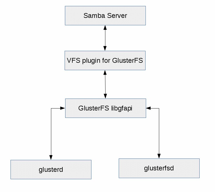 For Samba VFS plugin implementation, see the below diagram. With the plugin Samba calls get converted to libgfapi calls and libgfapi forward the requests  to GlusterFS.